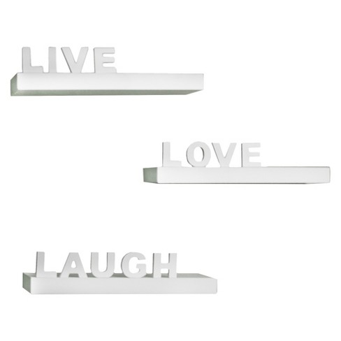 Decorative accents are perfect for filling in the gaps on shelves, tables, and walls, while also anchoring the space and drawing the eye to a whimsical pattern, playful pop of color, or an imaginative abstraction of art. Hanging wall shelves can truly add a distinctive appearance to a room, adding space for brilliant accenting pieces. This set of three shelves, with their inspirational reminder to live, love, laugh, are always on hand to remind you of the important things in life. Words that inspire make a clear statement on your wall. Decorative accessories indoor fireplaces outdoor decor accent pieces silk plants candles bring encouraging charm to your living space with the montclair william laminate 'live, love, laugh' these shelves feature a laminate construction with black painted words that you will love.